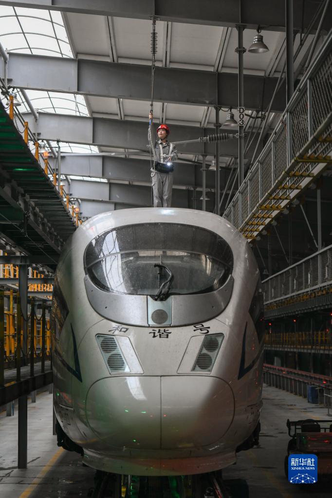 在中國鐵路哈爾濱局集團有限公司哈爾濱動車段整備庫,“雪絨花”女子班組的機械師們正緊張地為動車段配屬的動車組進行檢修作業,為即將到來的“五一”小長假鐵路運輸做好運力安全保障。