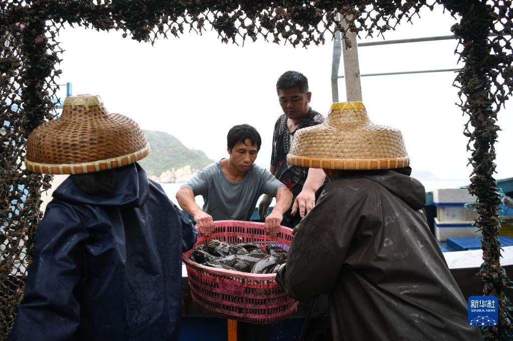 在廣東珠海萬山海域,中國首臺半潛式波浪能養殖旅游平臺“澎湖號”上,剛捕撈的石斑魚被運到前來收購的漁船上(4月25日攝)。