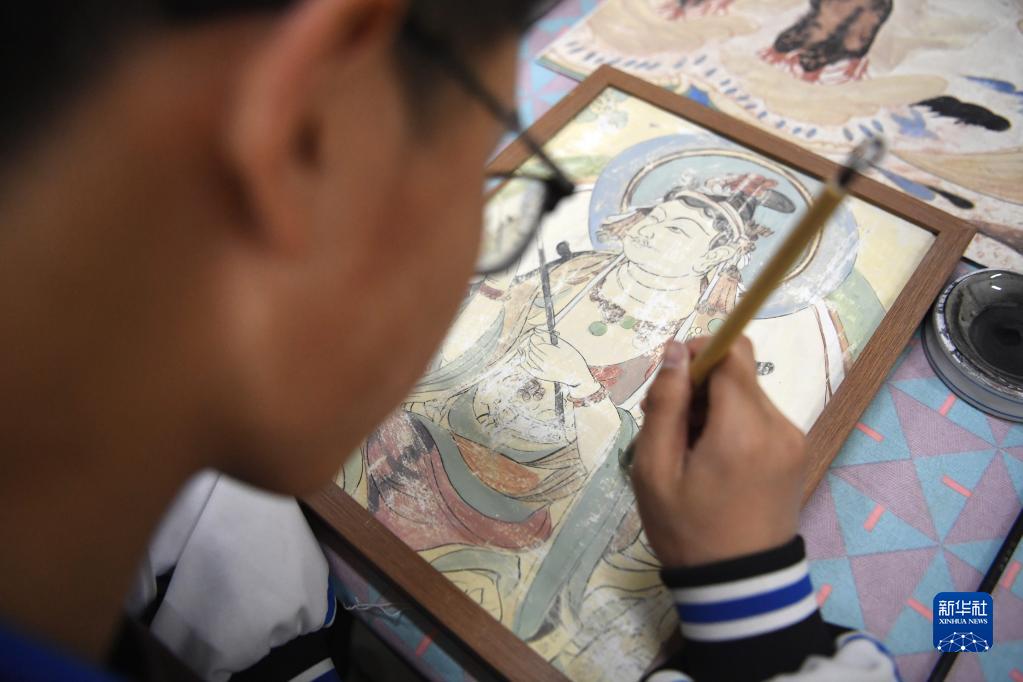 近年來,甘肅省敦煌市敦煌中學將敦煌壁畫藝術引入校園,整合專業師資力量,通過美術課堂、社團活動和主題實踐的方式,加強學生對敦煌壁畫藝術的了解,讓有興趣的學生在校園里開展壁畫臨摹和藝術創作,豐富校園文化生活,讓學生感受敦煌文化的魅力。