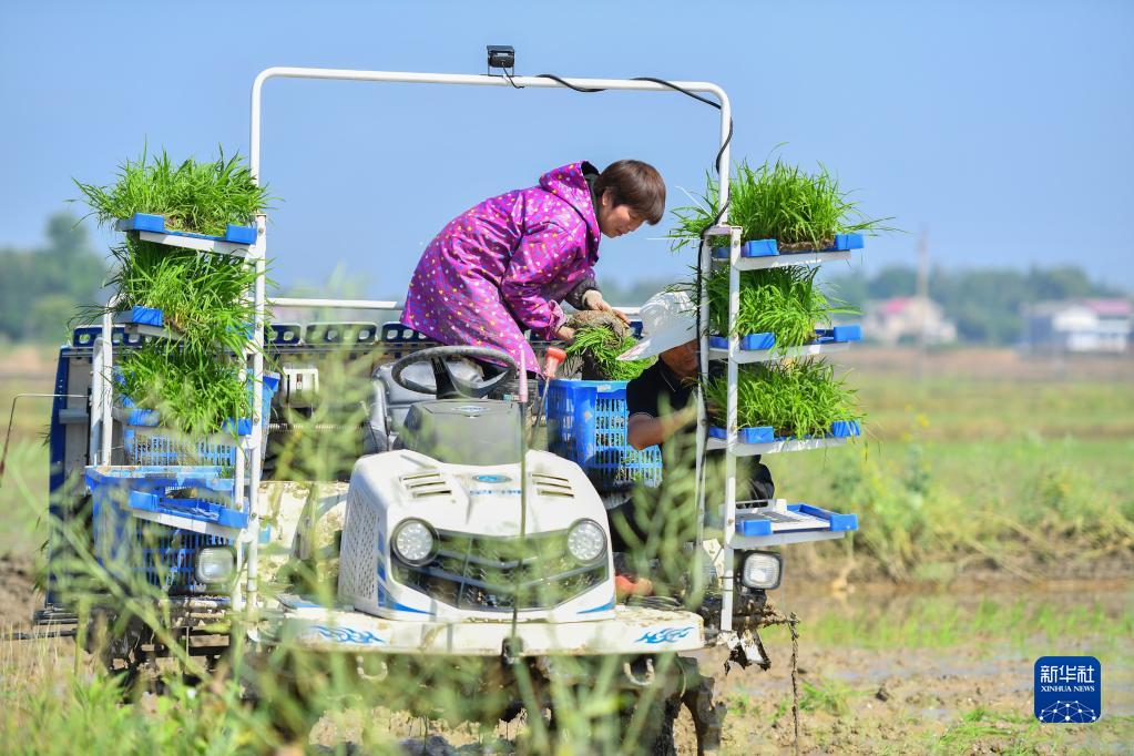 4月26日,在湘潭市雨湖區姜畬鎮易建河村的一處高標準農田,農民在整理插秧機上的秧苗。