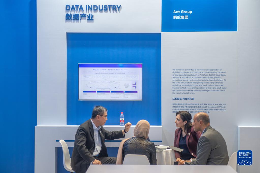 4月26日,在數據產業展區,螞蟻集團代表(左一)為參觀者講解。