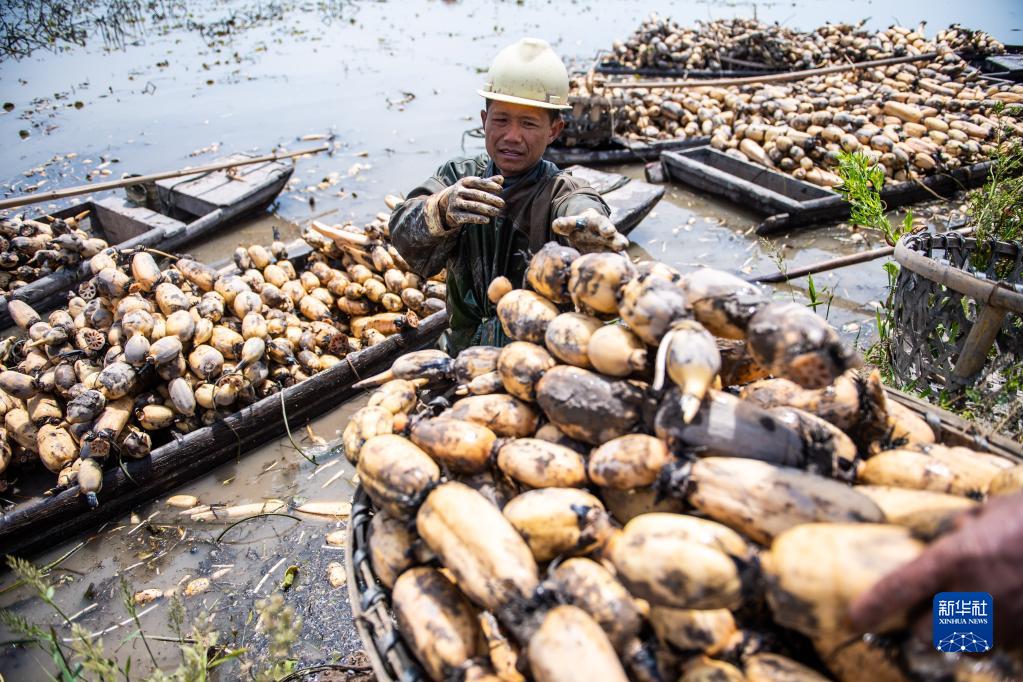 近日,湖南省益陽市南縣中魚口鎮種植的蓮藕迎來豐收,數十名藕農在荷塘中抓緊采挖蓮藕,日產量3噸左右。據了解,中魚口鎮種植蓮藕5000余畝,大力發展藕、蝦、魚套養,是當地傳統種植產業,產品主要銷往廣東、廣西以及湖南長沙等地。