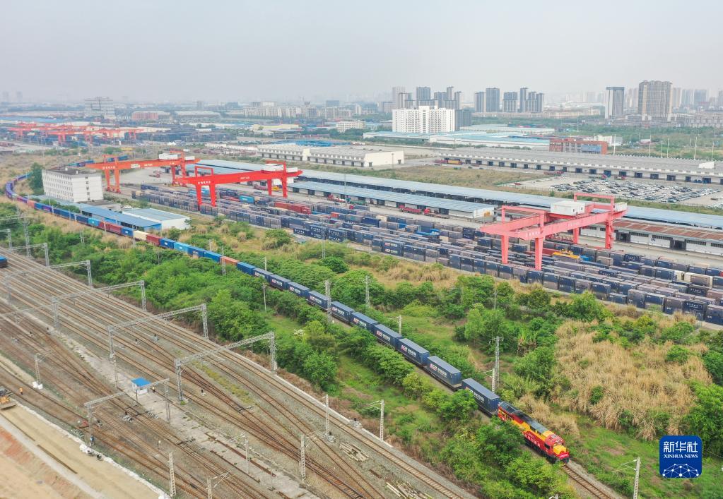 4月26日,“法國郵政DPD號”國際班列從成都國際鐵路港駛出(無人機照片)。
