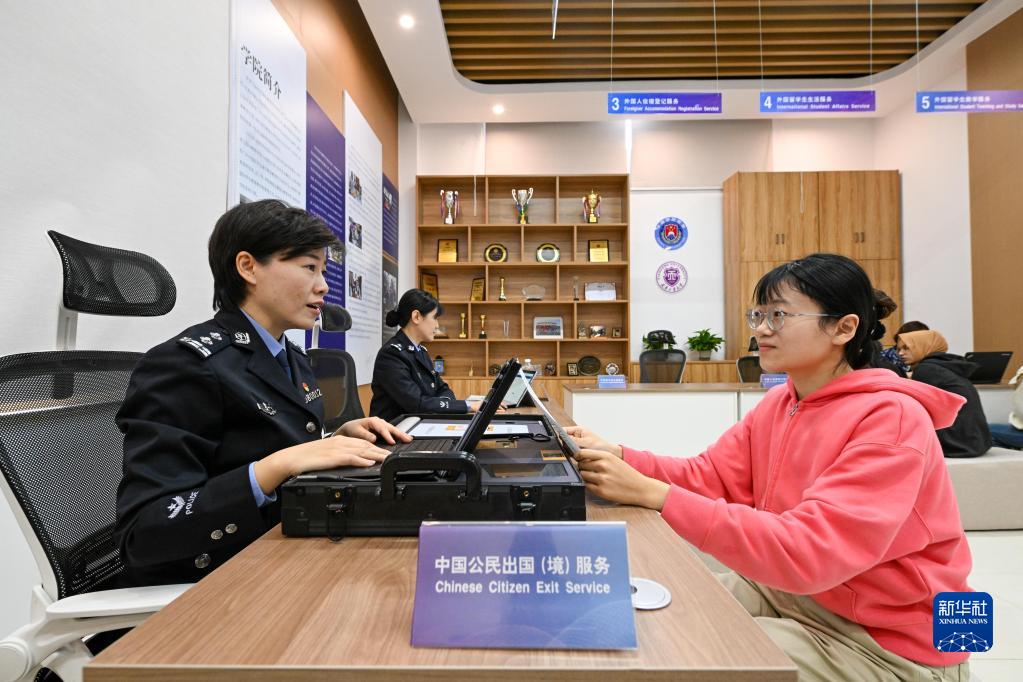 4月26日,在天津工業大學出入境事務服務中心,天津市公安局出入境管理局民警使用移動受理設備為學校學生辦理護照。