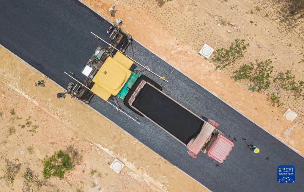 4月25日,工人在海南環島旅游公路東方段進行瀝青攤鋪施工(無人機照片)。
