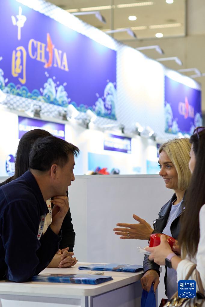 4月25日,在西班牙巴塞羅那舉行的全球水產品博覽會上,參展商和參觀者在中國展區洽談。