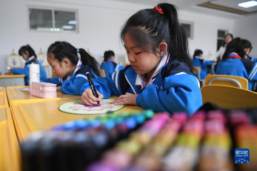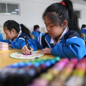 4月26日,在敦煌市西關小學,美術社團的學生在課后服務時間進行帶有敦煌壁畫元素的團扇繪畫。