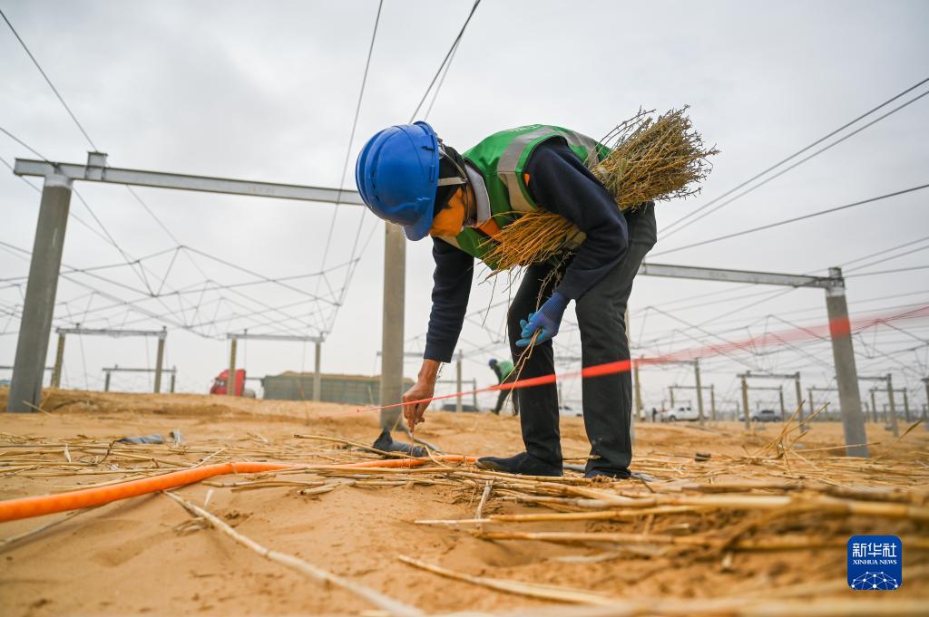 近日,在內蒙古自治區杭錦旗億利庫布其沙漠光伏治沙基地,工人們忙著在光伏架下種植耐旱苗木,用于防風固沙。目前,億利庫布其沙漠光伏治沙基地正在建設中,此次規劃種植面積上萬畝。