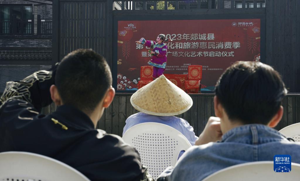 4月26日,在山東省臨沂市郯城縣,游客在郯國古城景區觀看戲曲表演。