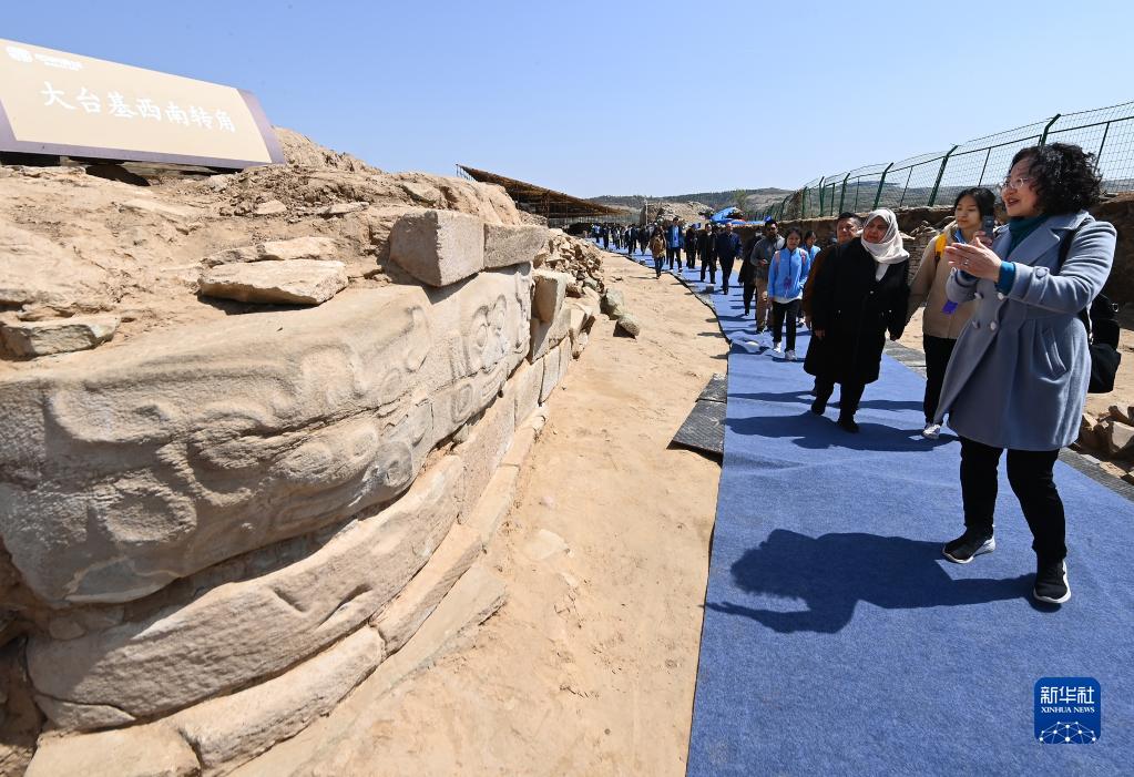 4月26日,外賓在陜西石峁遺址皇城臺遺址大臺基西南轉角參觀建筑浮雕。