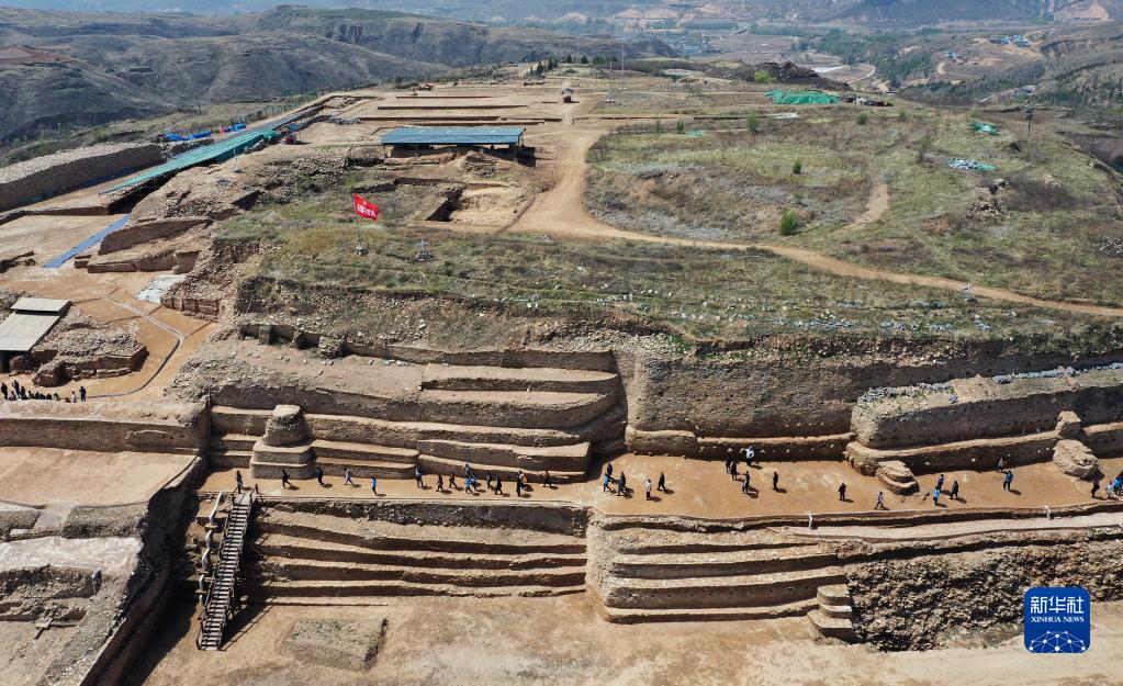 4月26日,外賓在陜西石峁遺址皇城臺遺址參觀調研(無人機照片)。