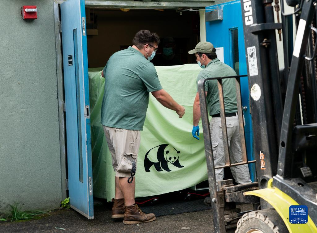 4月26日,工作人員在美國田納西州孟菲斯動物園搬運裝載大熊貓“丫丫”的箱籠。