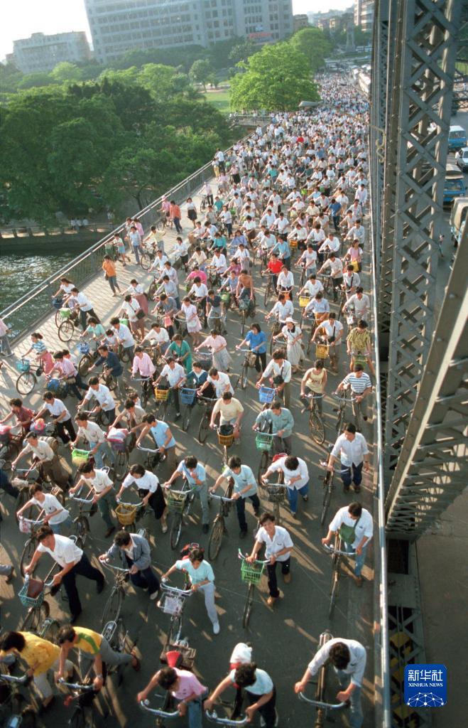 1989年廣州騎自行車上班的人流(資料照片)。