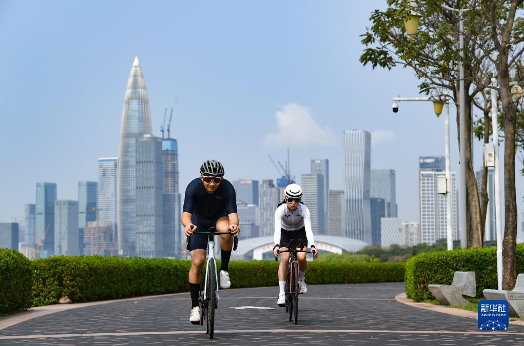 4月11日,騎行愛好者楊曉輝(左)、張倩在深圳灣海濱休閑帶綠道騎行。這個綠道傍海而建,風光旖旎,是深圳騎行愛好者的熱門打卡地之一。