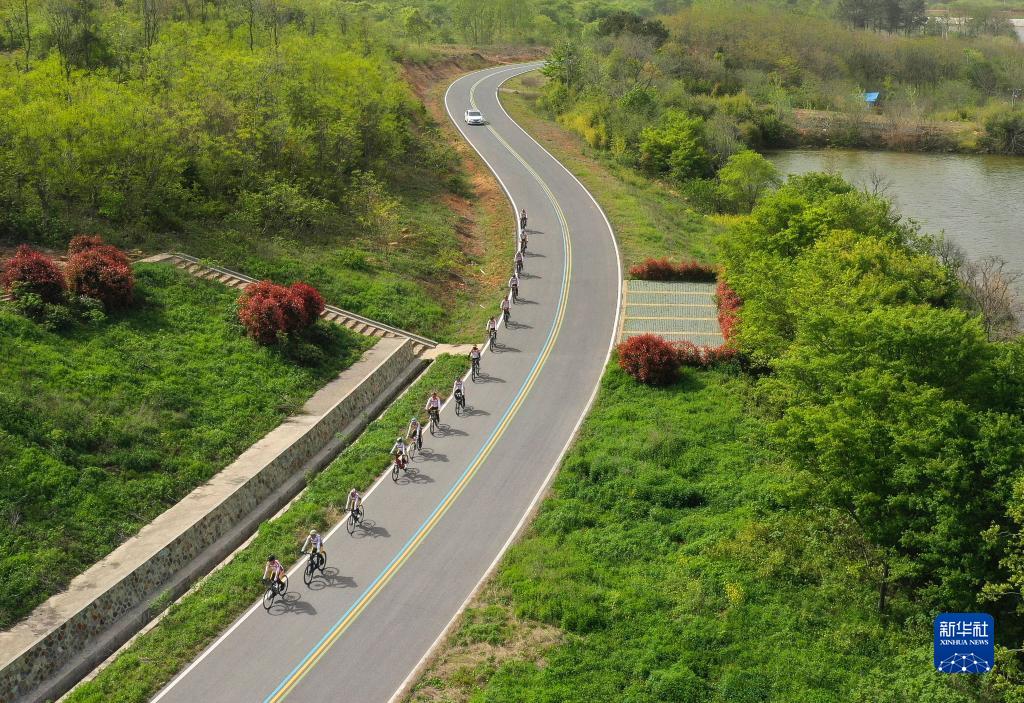 4月12日,騎行愛好者在江蘇省句容市天王鎮騎行(無人機照片)。