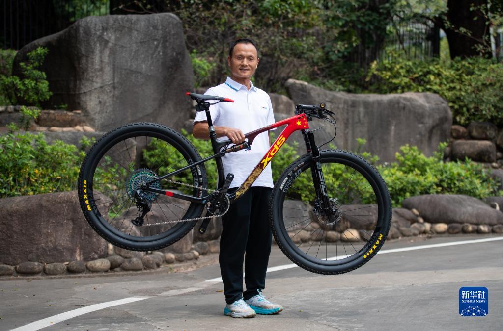4月13日,在深圳市喜德盛自行車股份有限公司,工作人員單手輕松拎起由超輕碳纖維材料打造的自行車。該車型曾經作為中國國家山地自行車隊東京奧運戰車,整車重量僅9.6千克。