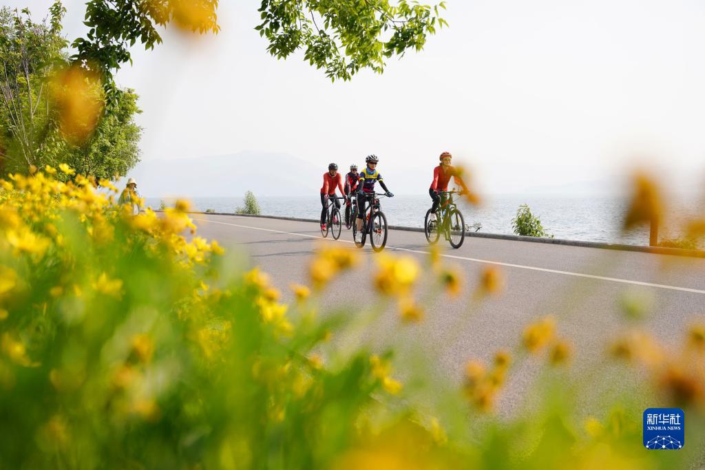 4月20日,騎行愛好者在云南大理洱海生態廊道騎行。