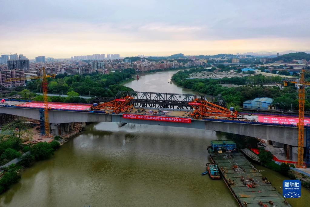 流溪河特大橋重達千噸的鋼箱梁主梁合龍(4月27日攝,無人機照片)。