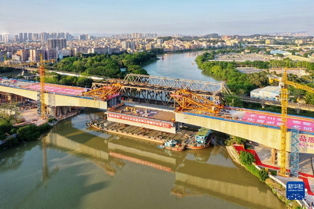 經過中鐵三局施工人員連續6小時整體吊裝和焊接,廣州白云火車站流溪河特大橋重達1100噸的鋼箱梁主梁與鋼混連接段于4月27日凌晨順利合龍。流溪河特大橋為京廣高鐵聯絡線和廣湛高鐵聯絡線四線鐵路并行橋梁。