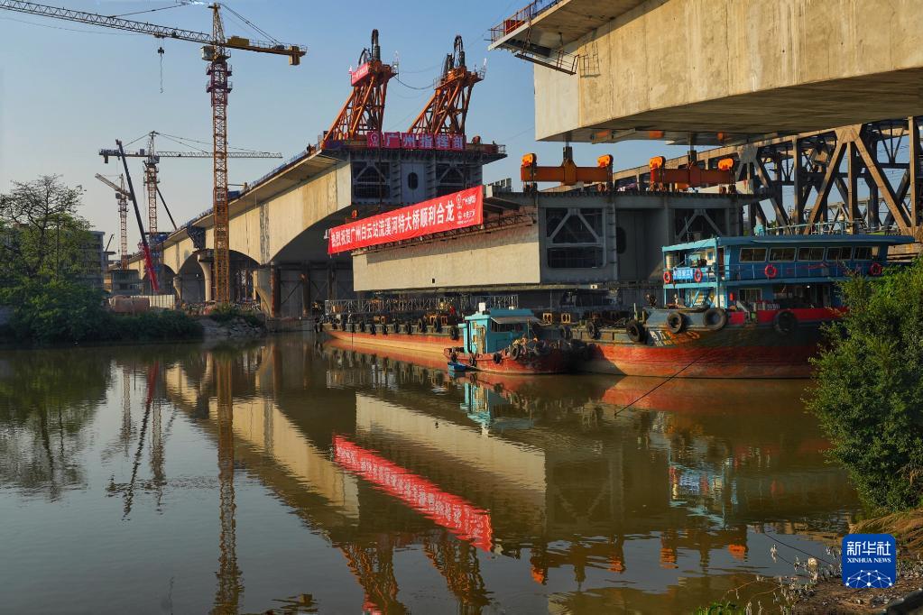 流溪河特大橋重達千噸的鋼箱梁主梁進行吊裝作業(4月26日攝)。