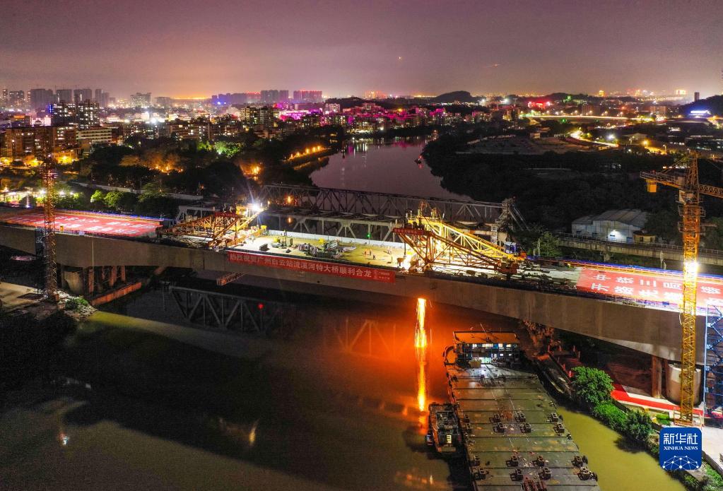 經過中鐵三局施工人員連續6小時整體吊裝和焊接,廣州白云火車站流溪河特大橋重達1100噸的鋼箱梁主梁與鋼混連接段于4月27日凌晨順利合龍。流溪河特大橋為京廣高鐵聯絡線和廣湛高鐵聯絡線四線鐵路并行橋梁。