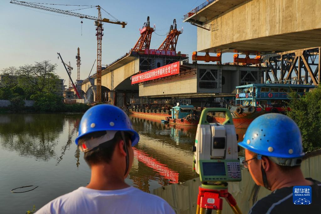 經過中鐵三局施工人員連續6小時整體吊裝和焊接,廣州白云火車站流溪河特大橋重達1100噸的鋼箱梁主梁與鋼混連接段于4月27日凌晨順利合龍。流溪河特大橋為京廣高鐵聯絡線和廣湛高鐵聯絡線四線鐵路并行橋梁。