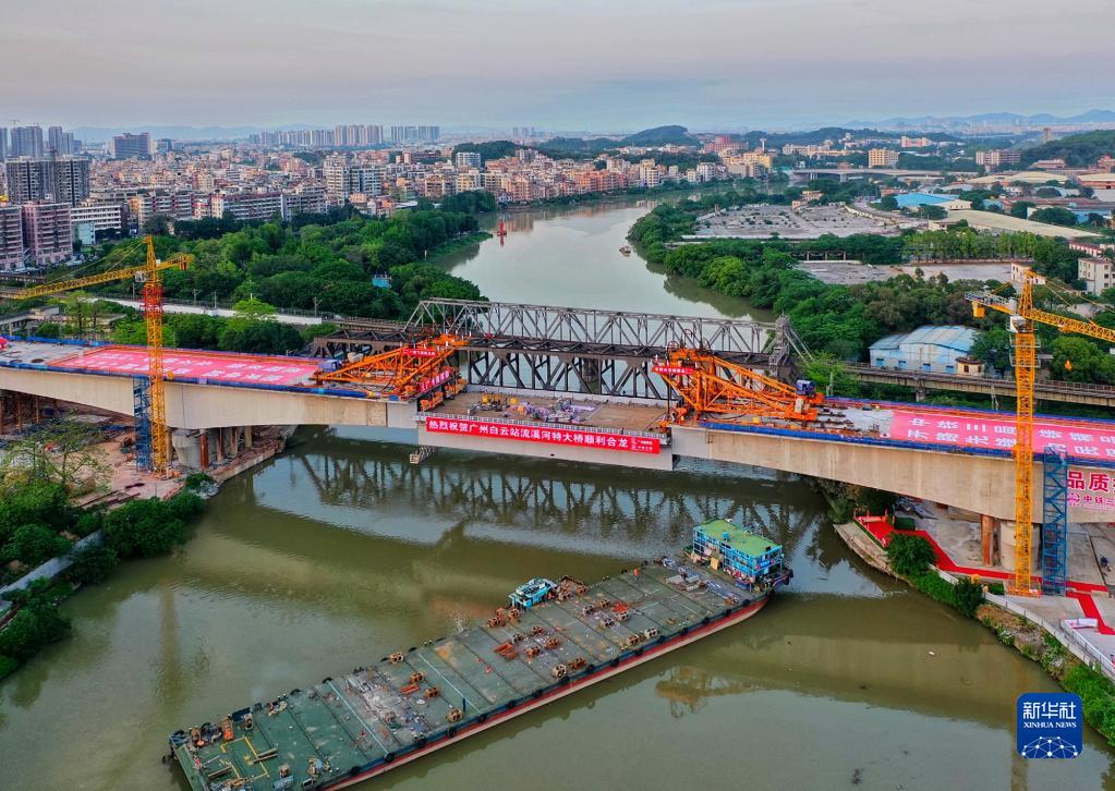 流溪河特大橋重達千噸的鋼箱梁主梁進行吊裝作業,在主控計算機精準操控下合龍間隙僅5毫米(4月26日攝,無人機照片)。