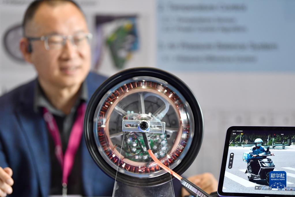 4月26日,在瑞士日內瓦,一名來自中國的發明家在第48屆日內瓦國際發明展上展示一款電驅系統。