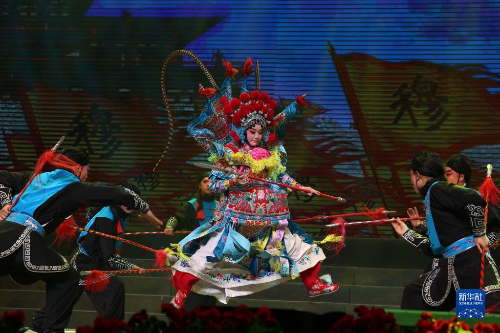 4月26日,河南省豫劇院青年團的演員在開幕式演出現場表演豫劇《大破天門陣》片段。