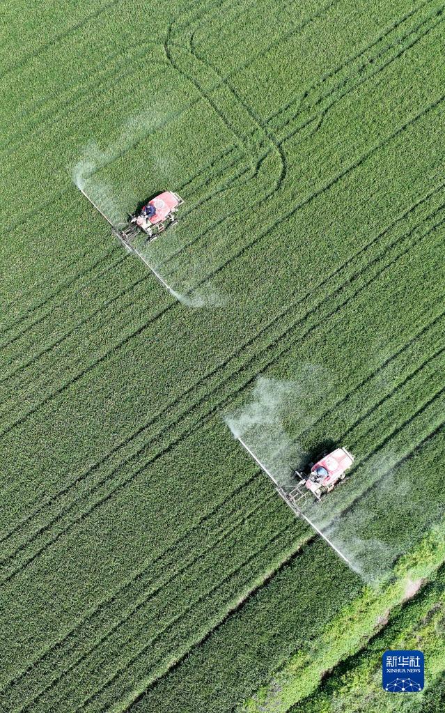 4月26日,在江蘇省淮安市洪澤區三河鎮,農民駕駛植保機械對小麥實施噴防作業(無人機照片)。
