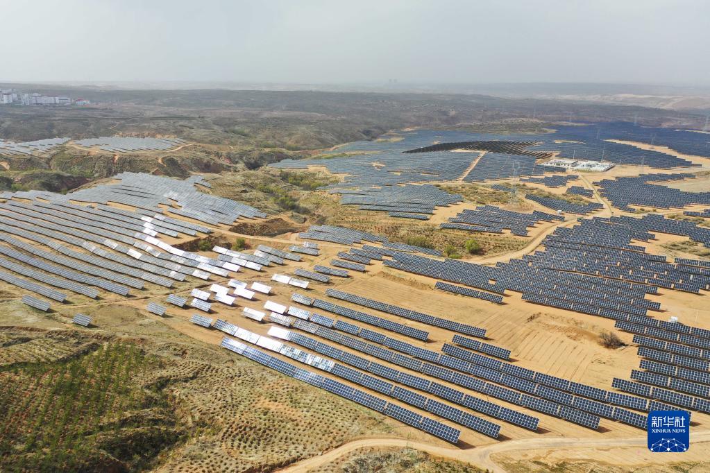 4月26日在內蒙古鄂爾多斯市伊金霍洛旗拍攝的天驕綠能50萬千瓦光伏項目(無人機照片)。