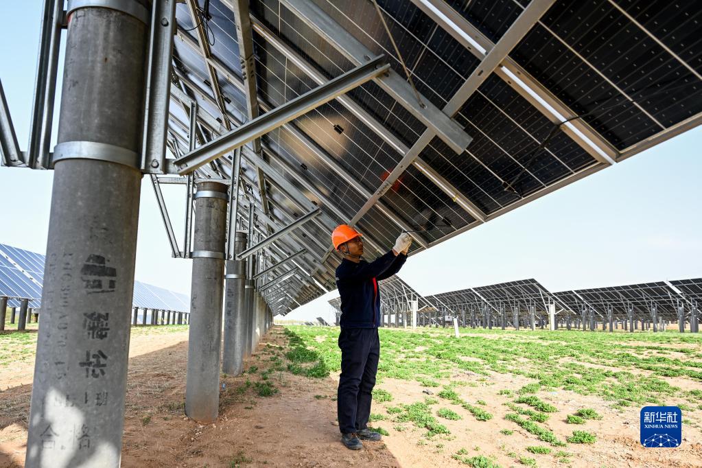 4月26日,工人在天驕綠能50萬千瓦光伏項目區內巡查光伏板。