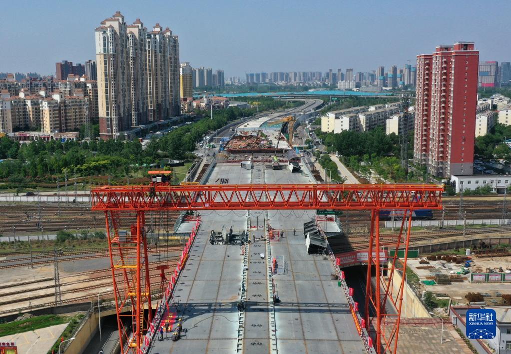 這是鋼箱梁合龍后的鄭州北三環新建彩虹橋(4月27日攝,無人機照片)。