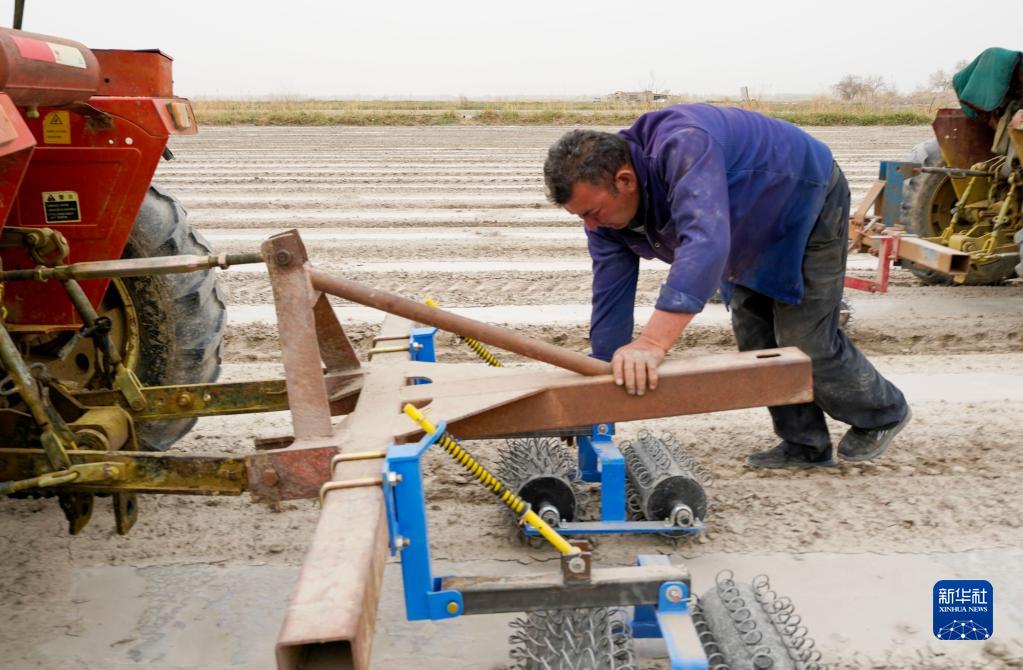 新疆尉犁縣巴西買里村,爾肯·熱衣木俯身壓著松土設備前行,以達到更好的松土效果(4月21日攝)。