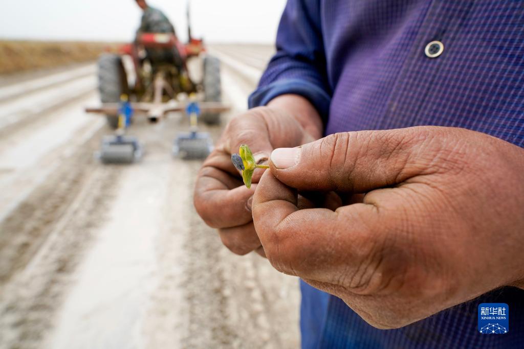 新疆尉犁縣巴西買里村,爾肯·熱衣木查看棉花嫩芽生長情況(4月21日攝)。