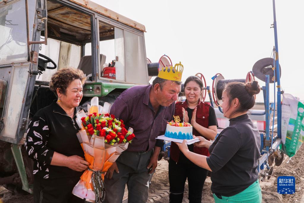 新疆尉犁縣巴西買里村,爾肯·熱衣木(左二)和家人一起在棉田里過生日(4月17日攝)。