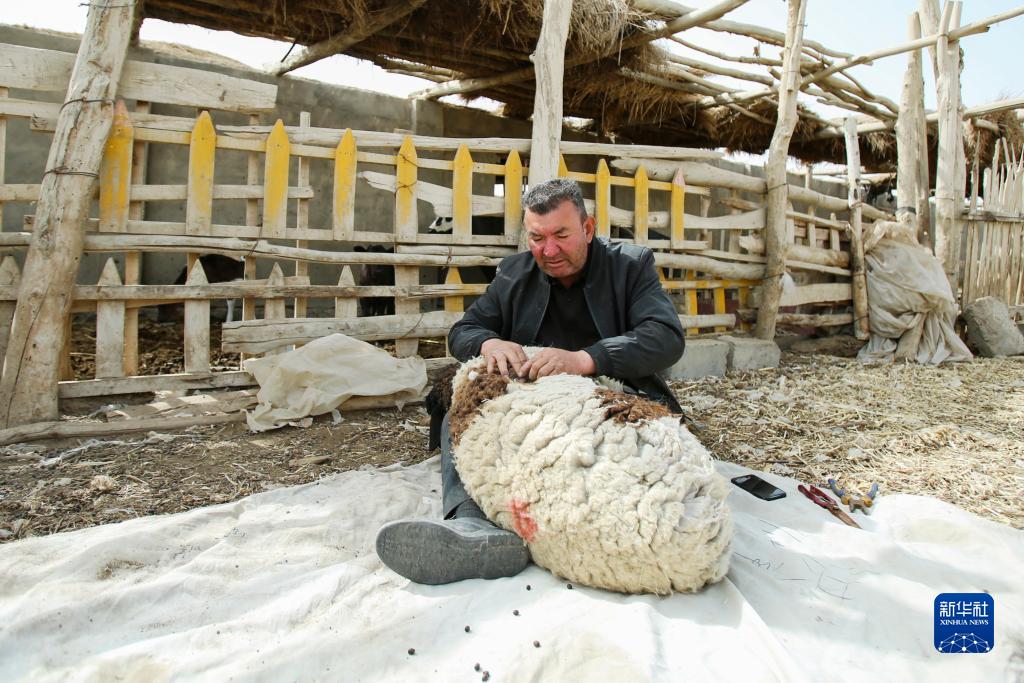 新疆尉犁縣巴西買里村,在棉田旁的羊圈里,爾肯·熱衣木在剪羊毛(3月29日攝)。