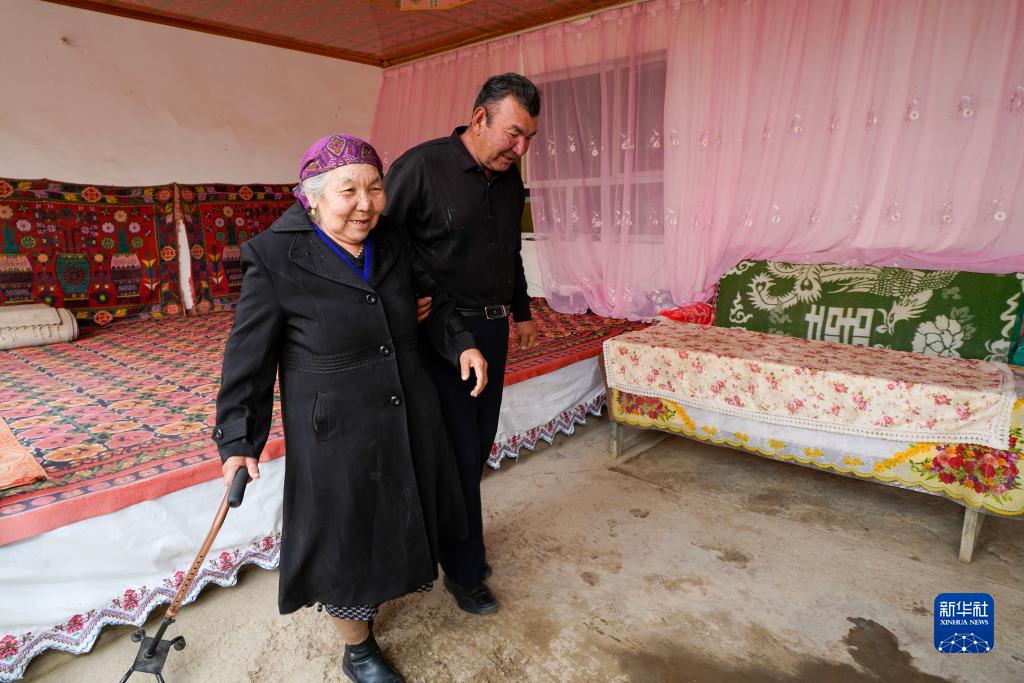 新疆尉犁縣巴西買里村,當日是肉孜節,爾肯·熱衣木攙著母親準備去吃飯(4月22日攝)。