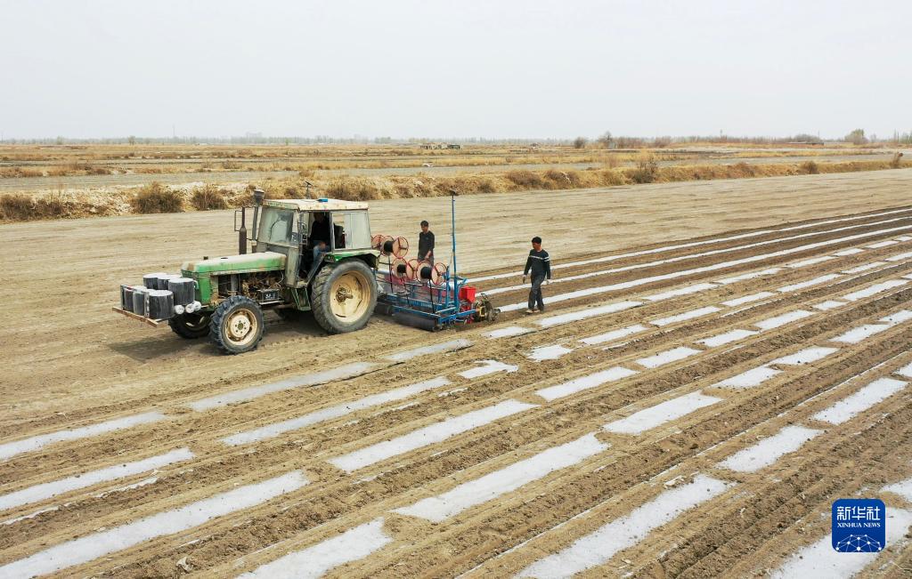 新疆尉犁縣巴西買里村,爾肯·熱衣木駕駛拖拉機春播(4月17日攝,無人機照片)。