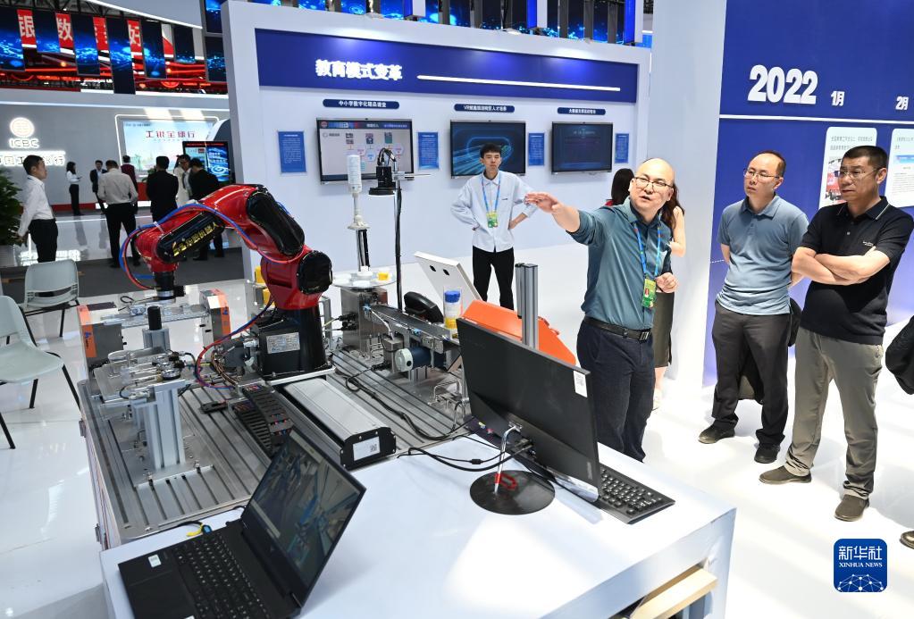 4月27日,在第六屆數字中國建設成果展覽會上,工作人員向參觀者介紹工業機器人應用編程一體化創新實訓平臺。