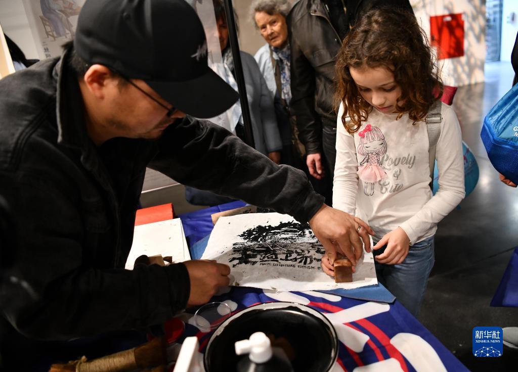 4月25日,在意大利佛羅倫薩舉辦的國際手工藝展覽會上,一名兒童體驗中國木版年畫拓印互動項目。