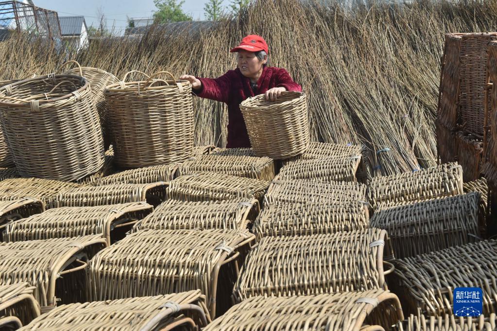 4月26日,臨沭縣歐拉工藝品有限公司員工在晾曬柳編制品。