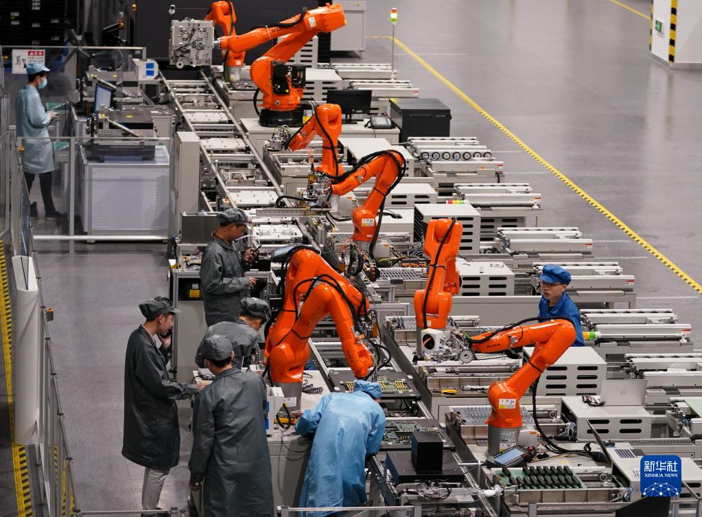 4月27日,在位于浙江杭州市蕭山區的紫光股份信息通信產品未來工廠,技術人員在調試生產線設備。