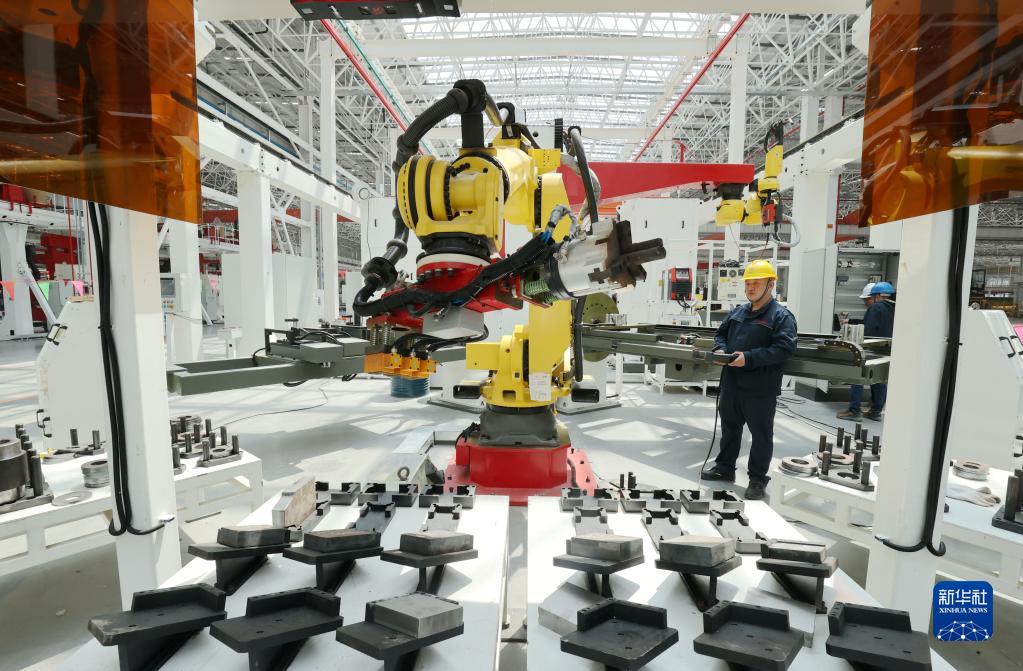 4月27日,在位于浙江湖州市吳興高新區的浙江三一裝載機智能制造基地,工人在調試智能化生產線。