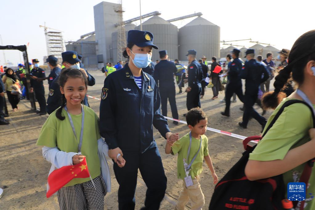 當地時間4月26日,中國海軍導彈驅逐艦南寧艦、綜合補給艦微山湖艦緊急駛赴蘇丹,執行撤離我在蘇丹人員任務。這是任務官兵在碼頭引導撤離人員登艦。