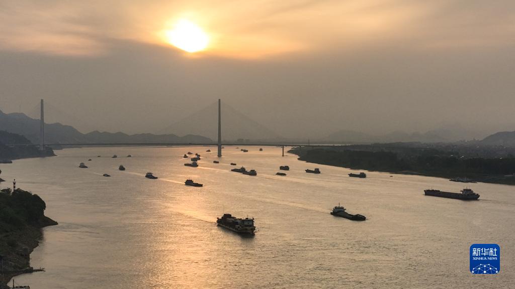 4月26日傍晚,在長江江西九江瑞昌段的航道上,往來船只與夕陽組成了一幅壯美畫面。