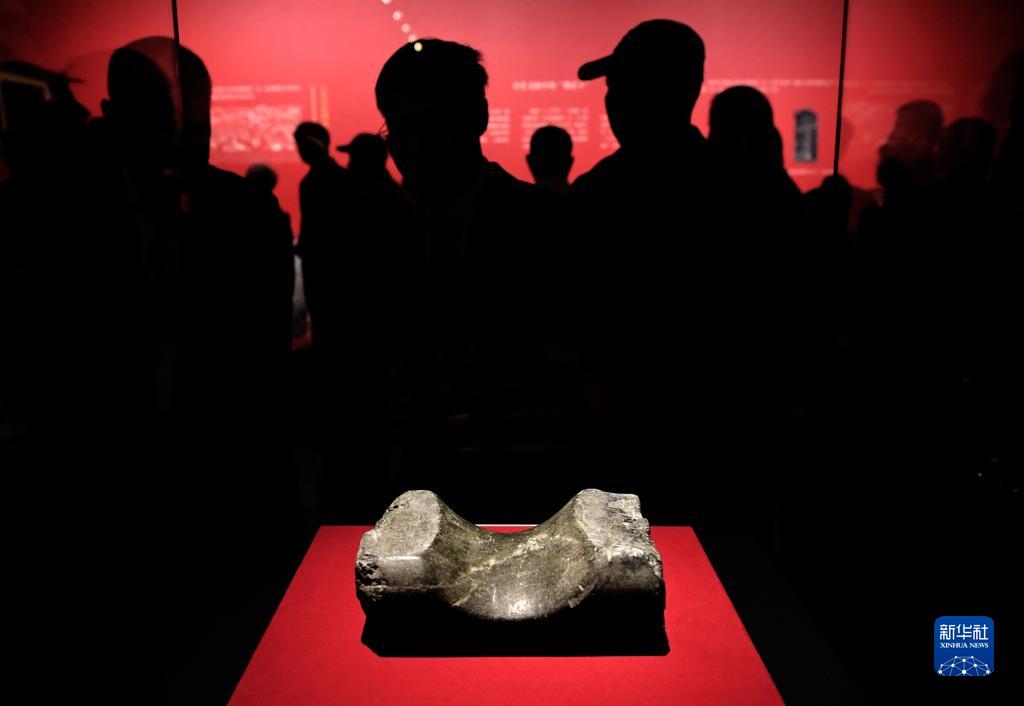 4月27日,參觀者在曹操高陵遺址博物館內觀看展品“魏武王常所用慰項石”石枕。