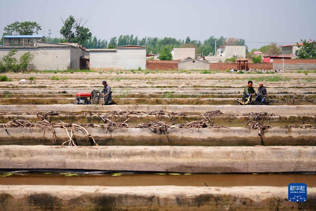 4月27日,在河北邢臺經濟開發區九家鋪村清水藕基地,農民在采挖藕苗。