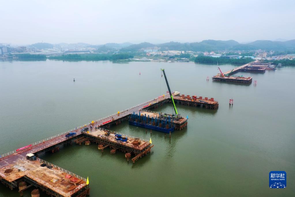 建設中的潭江特大橋橫跨700米江面(4月27日攝,無人機照片)。