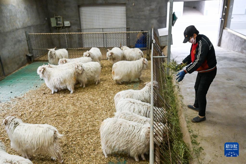 4月27日,在伊金霍洛旗蘇布爾嘎鎮敏蓋絨山羊原種繁育中心內,工人在投喂草料。